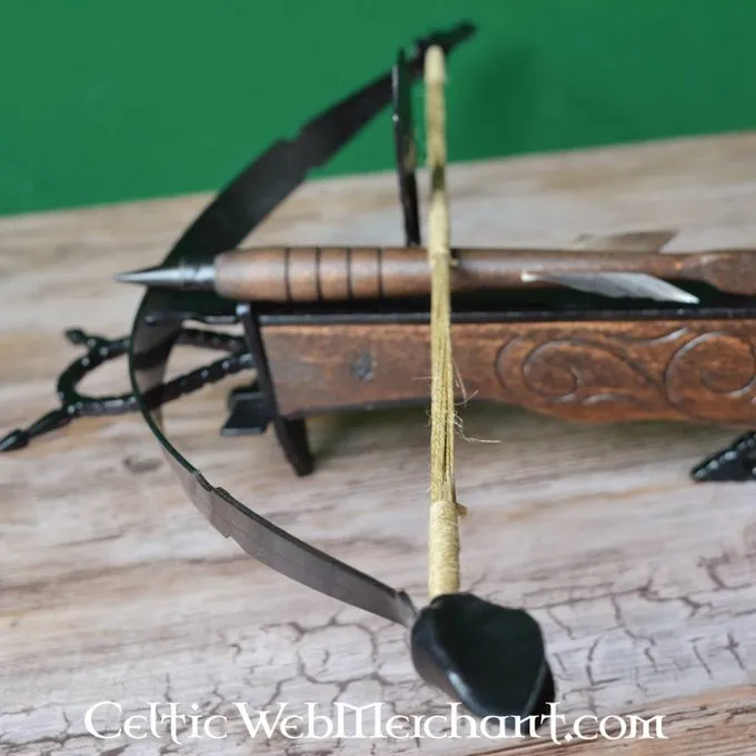 Længden af denne dekorative armbrøst 88 cm. Den er forsynet med jern lemmer.