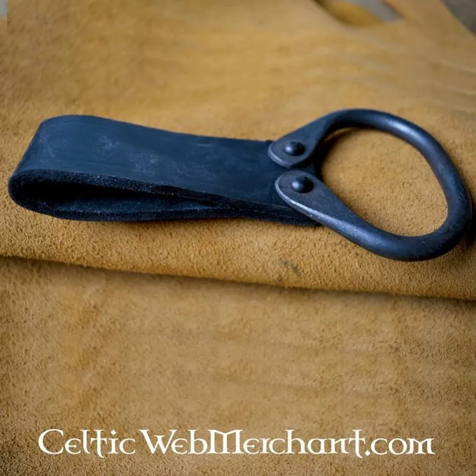 Dette er en autentisk og praktisk økse indehaver. Sløjfen kan fastgøres til bæltet, og en økse kan hænges på ringen. Indersiden af ringen er 7 x 4,5 cm. Holderen er lavet af ægte læder med et håndgjort, nitteed ring.
