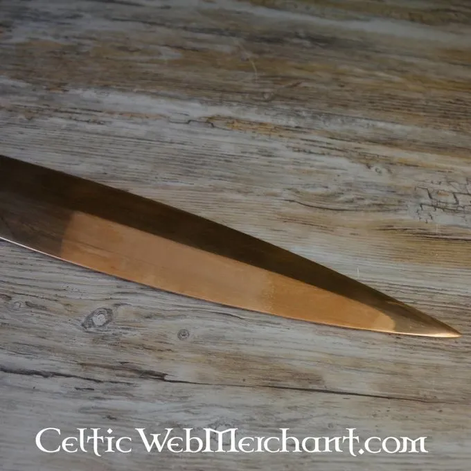 Produkt detaljer: Længde: 82 cm / Klingelængde: 66 cm / Grebets Længde: 16 cm / Vægt: 1480 g / Ståltype: Bronze / Kant: Halvskarpt / Tangkonstruktion: konstruktion with fuldt tang inclusief Knap / Grebets omvikling: Bronze / based on da historisk original