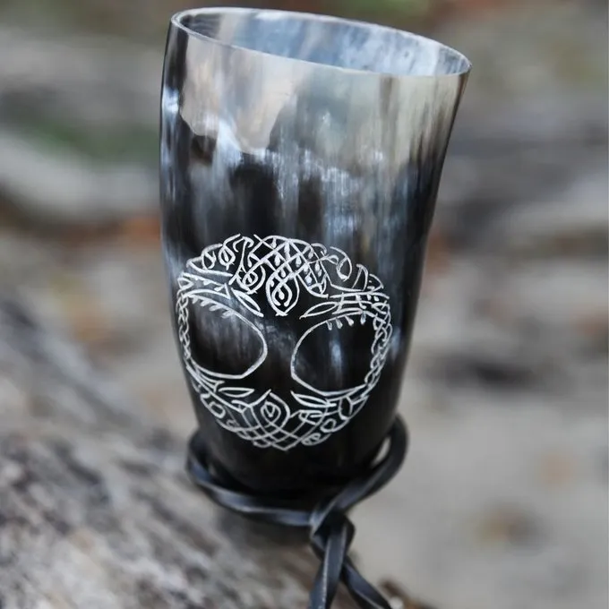 I løbet af århundreder er det at drikke horn blevet brugt af forskellige folk som en kop under ceremonier og fester. Brugen af drikkehornet nævnes endda i Edda. Dette horn er perfekt til Viking -genindførelse, boligindretning, LARP og laver en vidunderlig gave. Det er også ideelt til festivaler. Dette drikkehorn er hånd lavet af bøffelhorn og er poleret. Der er et lag lak på indersiden, så du kan drikke fra hornet. Det leveres med et metalstativ, som du kan placere det på bordet. Hornet er indgraveret med Yggdrasil, livets træ i norrøn mytologi. Yggdrasil er stedsegrøn og forbinder jorden, himlen og underverdenen. Det er et hellig træ og symboliserer viden, liv, udødelighed. Et populært symbol i hedenskhed.