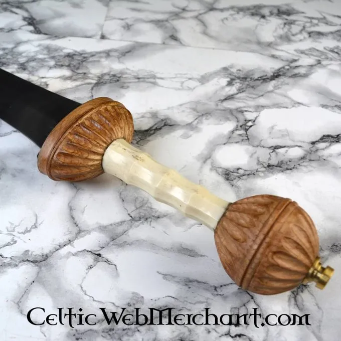 Detaljer / Materiale: DA45 fjederstål, træ, ben, messing / Samlet længde: 63,5 cm / Knap: skruet / Fuld tang / Klingelængde: 43,5 cm / Kant: halvskarpt / Baseret på historisk original / Vægt: 840 gram /