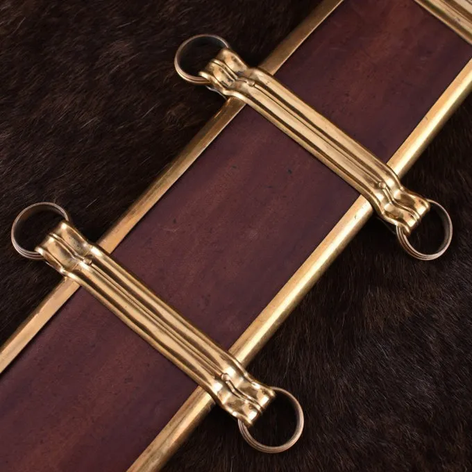 Materiale: DA45 foråret stål, træ, messing, læder / / Kant: semi-skarpe (til dekorative brug) / / Længde: 71 cm / / Blade længde: 52 cm / / Greb længde: 9,5 cm / / Maks. bladbredde: 5 cm / / Balancepunkt: ca.. 11 cm under fæstet / / Herunder læder skede /