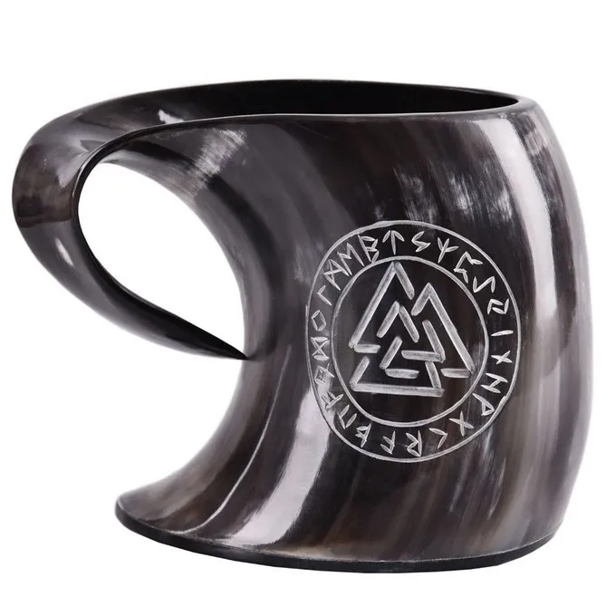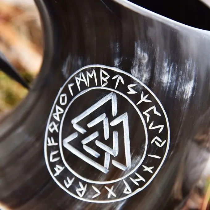 Denne smukke Horn Cup er håndlavet fra Buffalo Horn, poleret og indgraveret. Indersiden er forsynet med en lak, så du kan drikke kolde drikke fra den. Brug denne kop til LARP, festivaler eller til at nyde din yndlingsdrink derhjemme. Det er også et smukt dekorationsstykke og meget rart at give som en gave. Koppen er indgraveret med en Valknut. Dette motiv består af tre trekanter og vises på en række genstande af germanske folk. Dens betydning er ikke sikker, men det menes at symbolisere Odin. I dag er det et populært symbol i hedenskhed og Asatru.