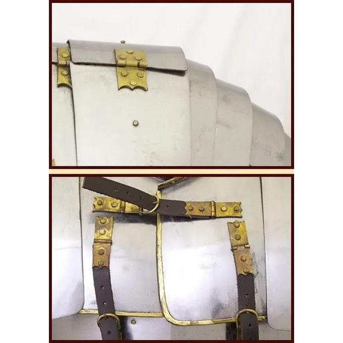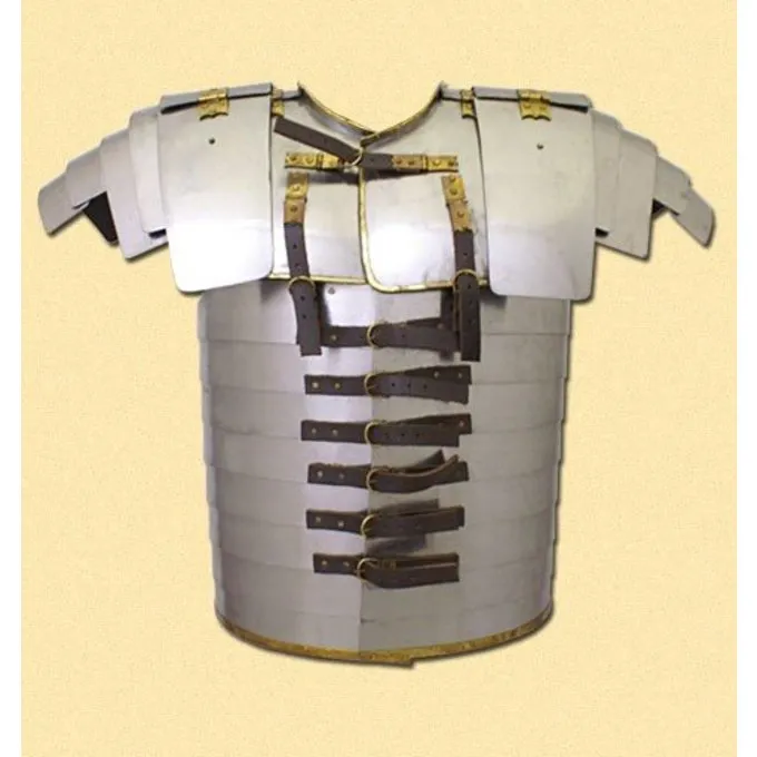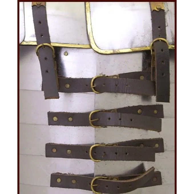 Denne lorica segmentata er fremstillet af 1,3 mm tyk stål og pyntet med messing. Det kan lukkes med læderremme på tværs af brystet. Den lorica segmentata kan justeres til den rigtige størrelse og er egnet til en brystmål op til 120 cm. Det vejer ca.. 7 kg