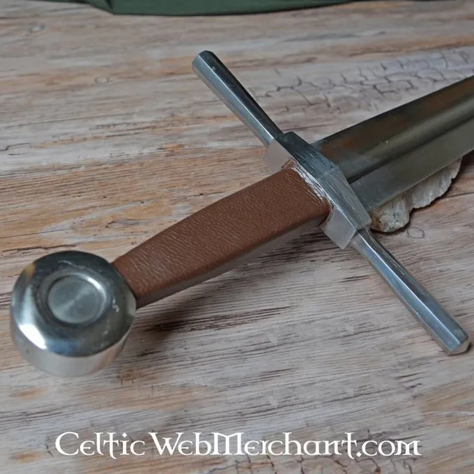 Produkt detaljer: Længde: 44,5 cm / Klingelængde: 30 cm / Grebets Længde: 14,5 cm / Klingens Bredde iam parerstangen: 3,8 cm / Ståltype: DA45 kulstofstål hårdhed 48 HRC. / Kant: halvskarpt / Tangkonstruktion: konstruktion with fuldt tang / Knap: skruet /