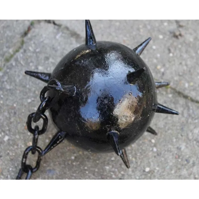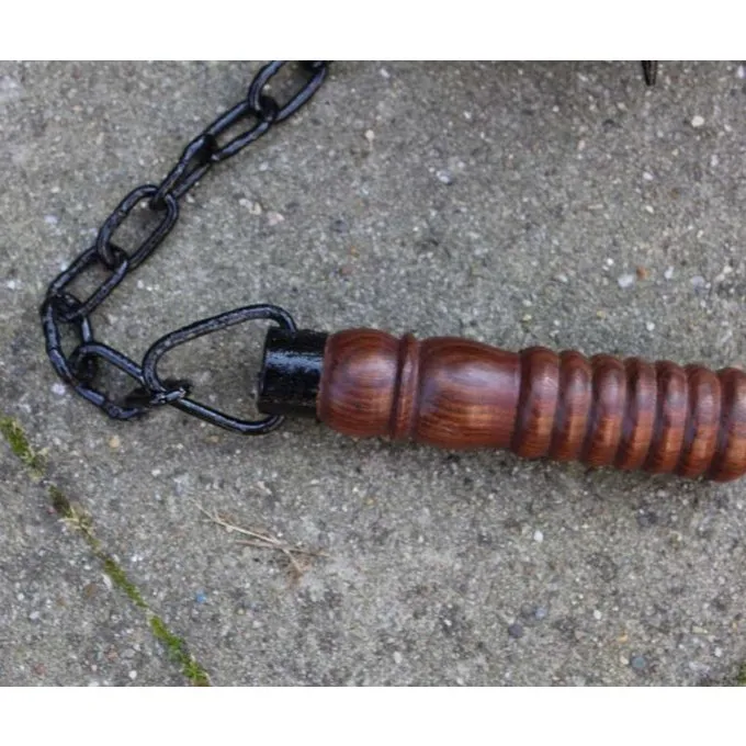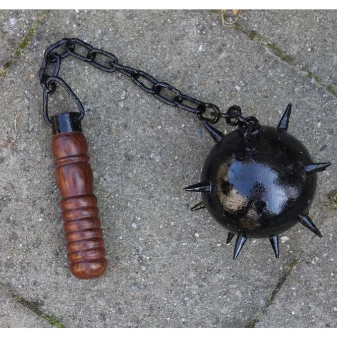 Denne stridsplejl har en hård træskaft og en metalkæde og bold. Håndtaget har en længde på 14 cm og kæden har en længde på 40 cm. Bolden med punkter har en diameter på ca.. 10 cm.