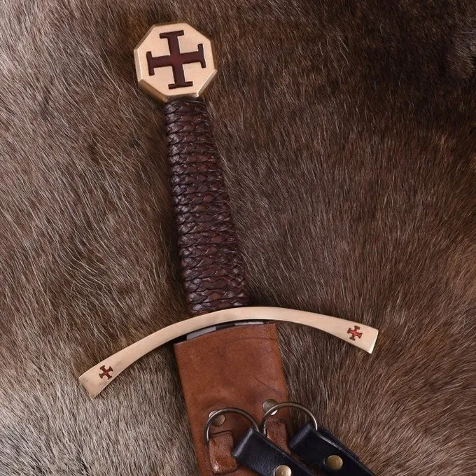 Dette dekorative Templar sværd har en kulstofstål klinge med en fyldigere. Grebet er lavet af træ og beklædt med flettet læder. Sværdet har en massiv cross-vagt og en ottekantet fæsteknap af messing. Både på tværs af vagten og de fæsteknap er dekoreret med røde emaljeret kors. Sværdet leveres inklusive en matchende skede. </ P>