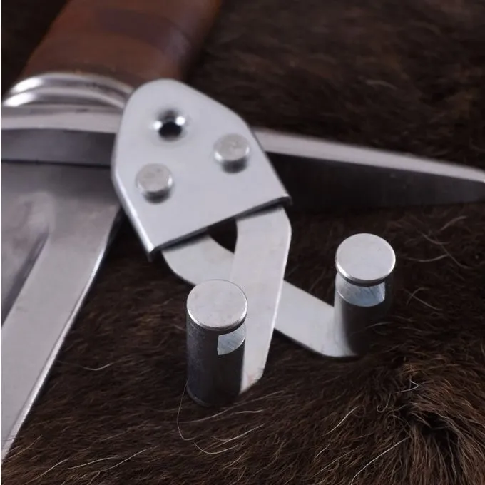 Detaljer / Materiale: stål / Længde: 5,5-7,5 cm / Bredde: 3 cm-8 cm / Max knivbredde: 6,9 cm / Max. bladtykkelse: 5 mm / Leveres uden skruer og vægstik /