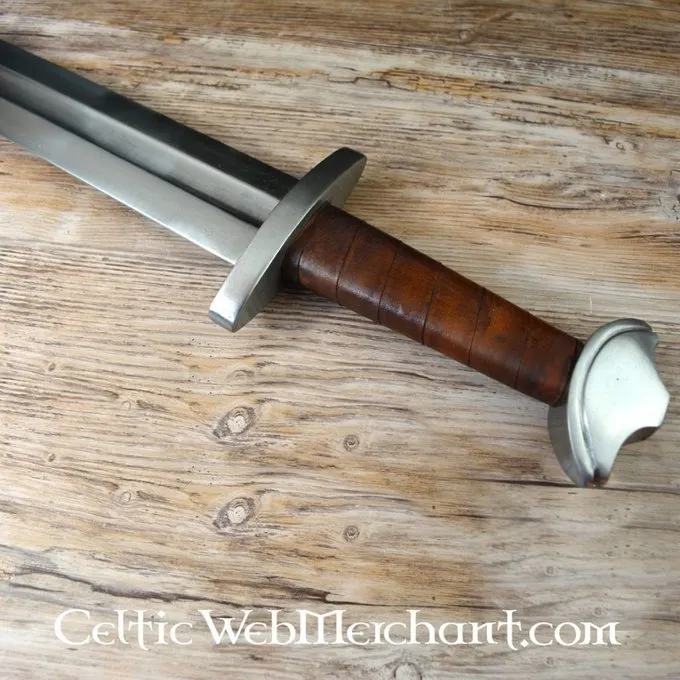 Detaljer / Materiale: EN45 fjederstålhårdhed 48-50 HRC / Totallængde: 93 cm / Bladlængde: 77,5 cm / Bladbredde: 5,5 cm / Pommel: Rivetted / Konstruktion: fuld tang / Blunt 2,5 mm kamp klar) / Vægt: 1300 gram / Baseret på historisk original /