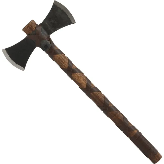 Dette Viking økse er baseret på tidlig middelalder originaler og kopier bruges i serie som vikinger og The Last Kongerige. Under den tidlige middelalder, økser var et vigtigt redskab i hverdagen. De blev brugt som våben, som redskaber til at hakke brænde, for reparationer, osv Hver husstand havde brug for mindst en økse til at overleve. Denne økse har en hånd-smedet finish og et træ skaft. Akslen og øksen hoved er dekoreret med læderremme. Et perfekt tilbehør til Viking reenactment eller for Viking kostumer.