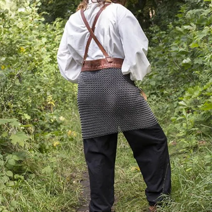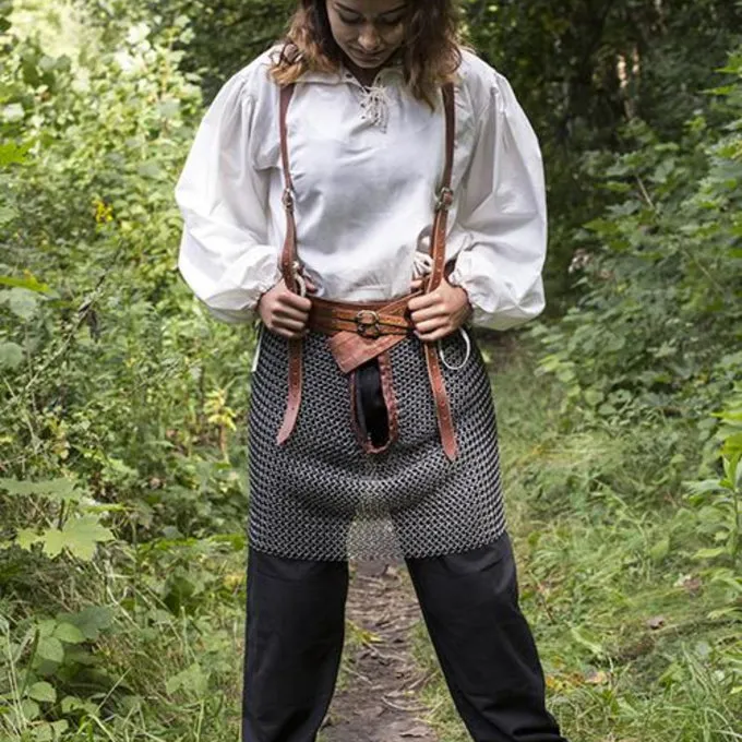 Denne nederdel er ideel til at bære under en kyrads. Den læderbælte giver dig mulighed for at fastgøre det omkring taljen. To læder skulderstropper gør det behageligt at have på. Den chainmail skørt er fremstillet af butted mildsteel ringe i et 4: 1 konstruktion.