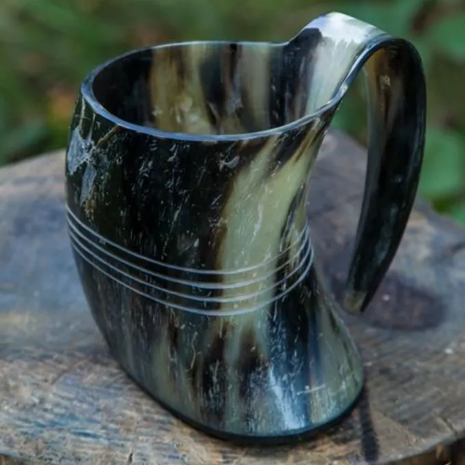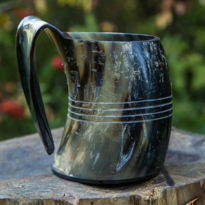Håndlavede horn drikkebæger som anvendes i forskellige serier, ligesom vikingerne, Game of Thrones og The Last Kongerige. Dette krus kan indeholde op til 0,5L af din favorit drik. Koppen har et håndtag til at holde det. Ydersiden er glat poleret til et luksuriøst udseende og er smukt dekoreret med fire indgraverede ringe omkring koppen. Indvendigt er også poleret og forsynet med et beskyttende lag, således at det er egnet til indtagelse af væsker. Bemærk venligst: hans krus er ikke egnet til varme væsker. Perfekt til festivaler, re-enactment, larp eller bare slapper af derhjemme på sofaen.