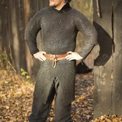 Denne type hauberk blev ofte brugt i middelalderen. Splitten gør den nemmere at bruge, når man rider på hest, og gør bevægelsen lidt lettere. Hauberken har halvlange ærmer og er lavet af blødt stål.