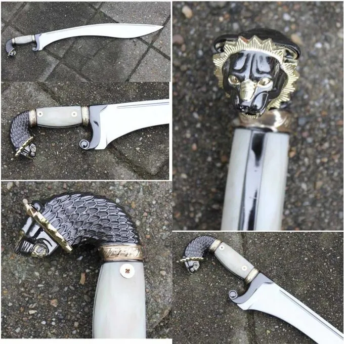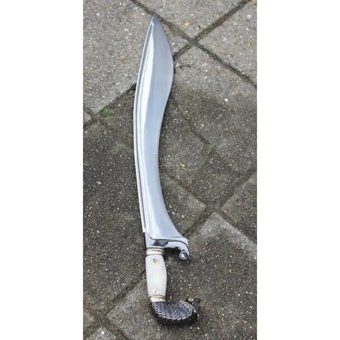 falcata 74 cm lang, med en klinge på 58 cm lange. Fæstet er lavet af knogler og messing og er indrettet i den græske kunst stil