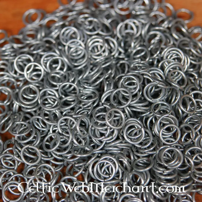 Denne pakke består af 1 kg forzinkede kæde mail ringe (1750 op til 1850 stykker) til fremstilling eller reparation af en brynjefrakke af coif. For at gøre en coif du har brug for ca.. 2,5 til 3,5 kg af ringe. Ringene har en indre diameter på 8 mm og er 1,6 mm tykt