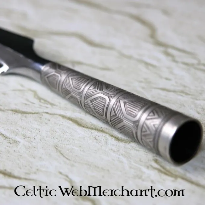 Produkt detaljer: Længde: 41,3 cm / Hovedstørrelse: 24.8 cm / Ringdiameter: 2,5 cm / Vægt: 340 g / Materiale: DA45 fjederstål hårdhed 48-50 HRC. / Kant: Skarp / skaft medfølger: nej / based on da historisk original: ja /