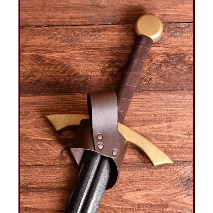 En brun sværd holder til latex larp sværd. Fås i to størrelser med en åbning på 7 cm og en åbning på 10 cm. Indehaveren af sværd kan fastgøres til bæltet med en løkke. Holderen forhindrer bladet af sværdet hængende fremad.