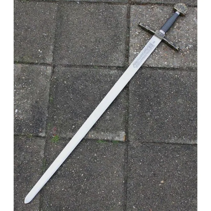 Dette er en smukt dekoreret sværd med en indgraveret blad, Knap og cross-vagt. Grebet er færdig med messing detaljer. Længden af sværdet er 100 cm. Den er lavet af Toledo stål.