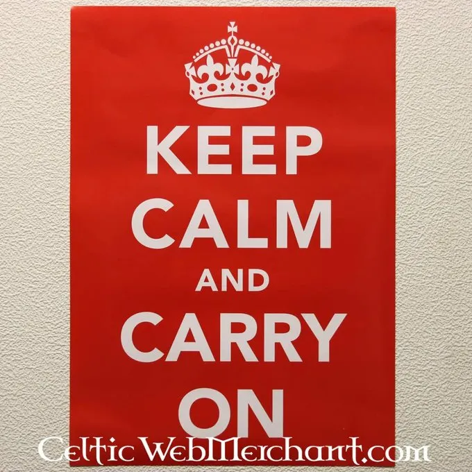 Sloganet “Bevar roen og fortsætte” blev brugt på en motiverende plakat i 1939, som forberedelse til Anden Verdenskrig. Det var meningen, at styrke moralen af de britiske borgere. Denne replika plakat er trykt på A3-papir.
