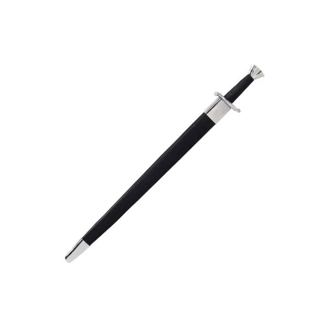 Detaljer: Materiale: kulstofstål, læder; Bladlængde: ca. 68 cm; Total længde: ca. 85 cm; Kant: skarp; Sharp tip; Grip: sort læder; Herunder sort læder skind; Fuld tang konstruktion; Baseret på en historisk original: ja Transportvægt (gram): 2000 “*