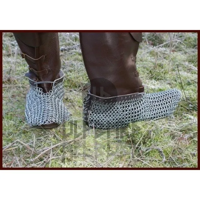 Disse kæde mail sabatons kan nemt bæres over historisk fodtøj. De er lavet af galvaniseret gathered Runde ringe med en indre diameter på 8 mm. De forlader den eneste åbne og på oversiden de har en læder kant