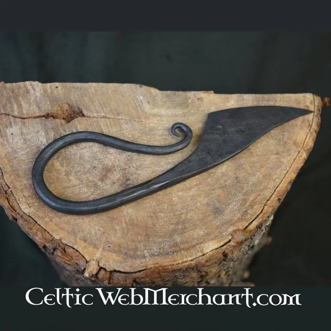 Den krølle på håndtaget giver denne kniv en typisk nordlige udseende. Knive som denne blev brugt i hele middelalderen til flere formål. Kniven er hånd-smedet fra kulstofstål, det har en klinge på 8,5 cm og dens samlede længde er 20 cm. Vejviser Produkt detaljer:
