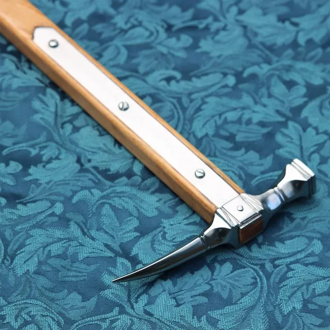 Materiale: 1065 kulstofstål, læder, træ / Tip: mellem semi-skarpe og stumpe. Let at sløve til reenactment brug / Længde: 63,2 cm / Længde hammerhaj: 16 cm / Greb længde: 23,3 cm / Balancepunkt: 21 cm under hammerhaj / Vægt: 742 g / Baseret på en historisk