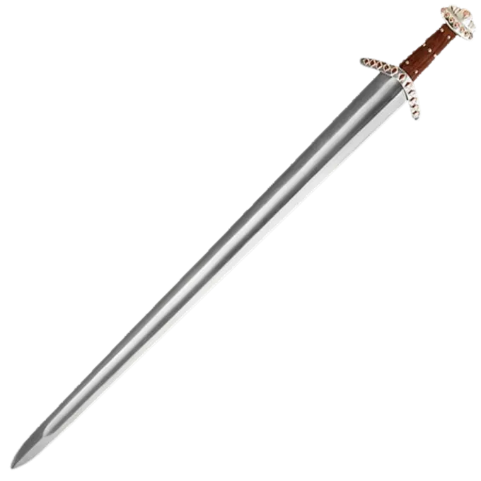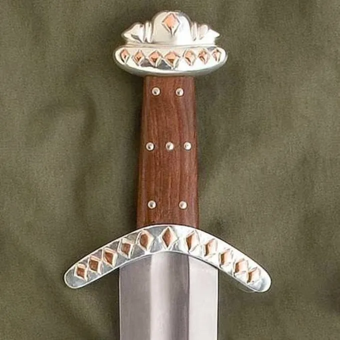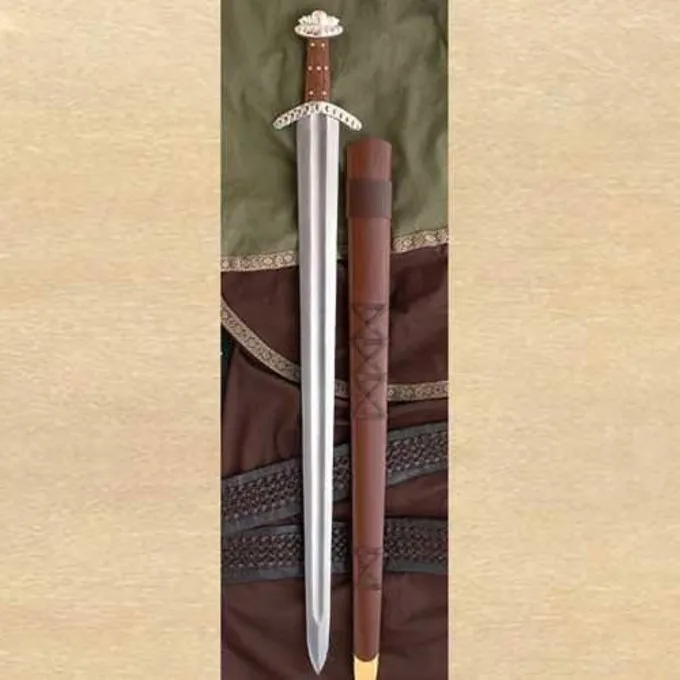 Denne kopi er lavet efter en af ??de smukkeste historiske sværd fra vikingetiden. Den oprindelige sværd er del af samlingen af ??British Museum. Sværdet blev fundet i floden Witham i Lincoln. Det har en cross-vagt og en fæsteknap med kobberlegeringer sugetabletter, stålet er forsølvet. Grebet er lavet af træ med forsølvede negle. Bladet af originalen har indskriften LEUTFRIT, som er formentlig Viking smeden der smedet sværdet. Dette sværd har intet navn på klingen, men du kan altid vælge at få det indgraveret. Som alle Viking sværd fra denne æra, sværdet har en bred fyldigere med henblik på vægttab. Swords som denne blev brugt af islandske vikinger, norske vikinger og resten af ??vikingerne. Sværdet er leveret, herunder en skede. Den semi-skarp klinge er smedet og hærdet fra 1065 kulstofstål og har en hårdhed på 48-52 HRC. En smuk dekorativt sværd til din samling af Viking sværd og slid med en Viking kostume eller med din reenactment gear. Hvis du blunten bladet, er det en perfekt træning sværd til sværdkamp eller re-enactment kampe.
